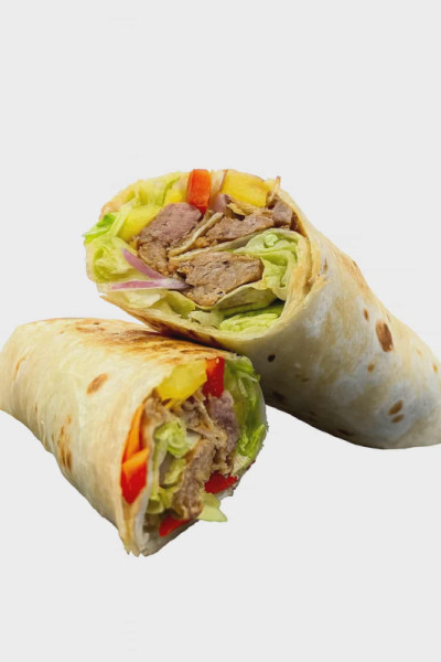 kuřecí stripsy, tortilla, okurka, rajče, ledový salát, burger omáčka