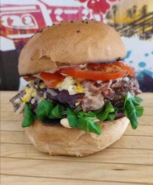 hovězí maso, máslová bulka, čedar, slanina, kvašená okurka, červená cibule, rajče, polníček, švestková omáčka